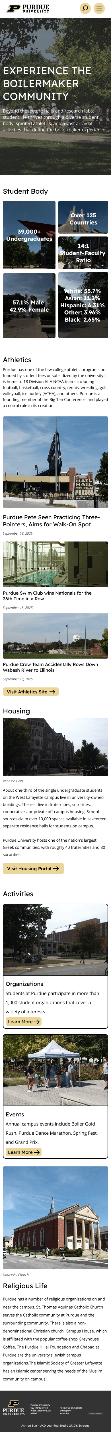 With a structure in place, I moved to Figma to create low-fidelity wireframes for the homepage, "Explore Purdue," and "Life at Purdue" pages. I designed for both desktop and mobile viewports.