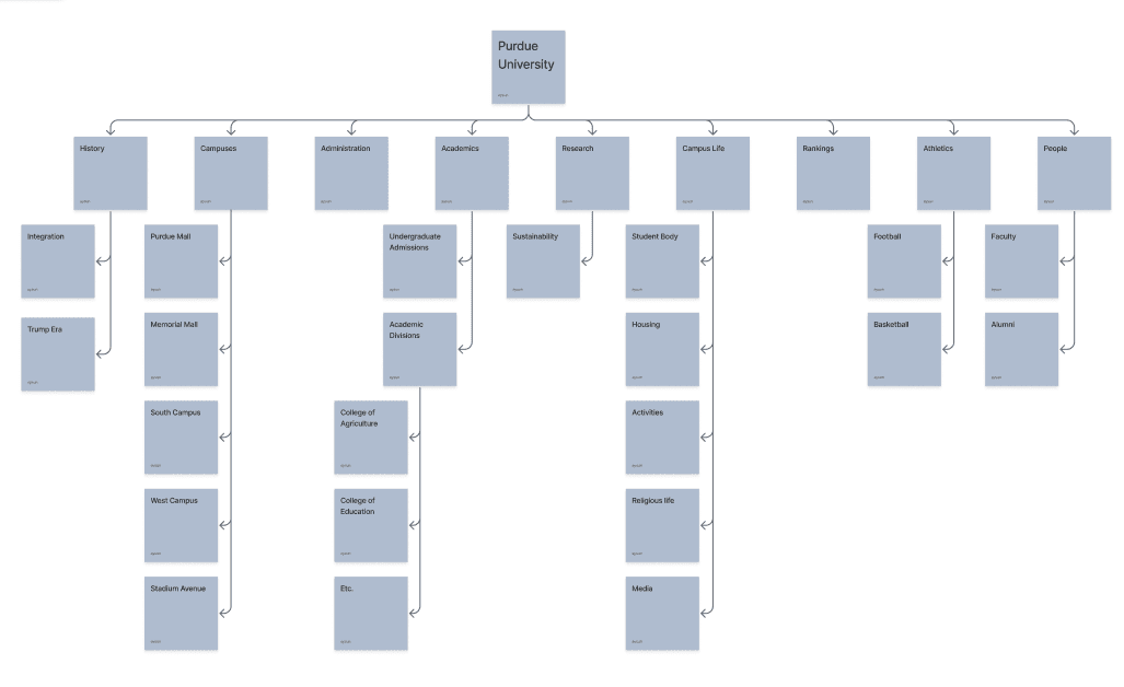 Reduced High-Level Sections: I consolidated numerous topics into five broad, intuitive categories: About, Academics, Admissions, Research, and Life at Purdue.